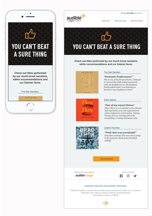 Audible needed emails to prevent customers from lapsing after having a less than enjoyable listening experience. Phase one was to let the listener know that Audible understands the importance of a good book and that they can easily swap out one they didn’t enjoy at no cost to them. Phase two provided listening recommendations based on their profile and listening habits.